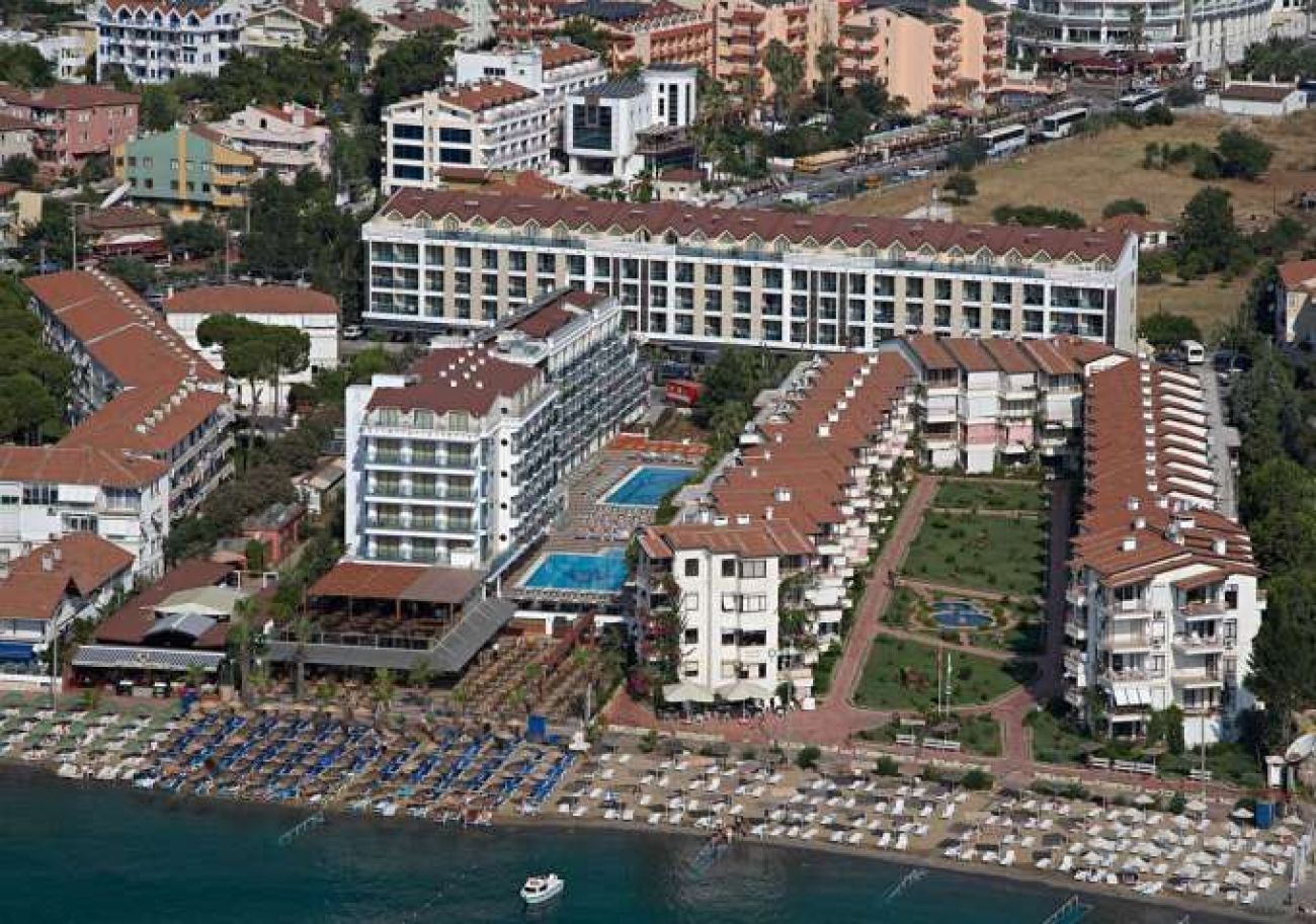 Хотелът се състои от две сгради и е разположен на 91 км от летището в гр. Даламан, на 3 км от центъра на Мармарис, Emre на 50 м от брега на морето (през улицата), Emre Beach на брега на морето със собствен плаж.