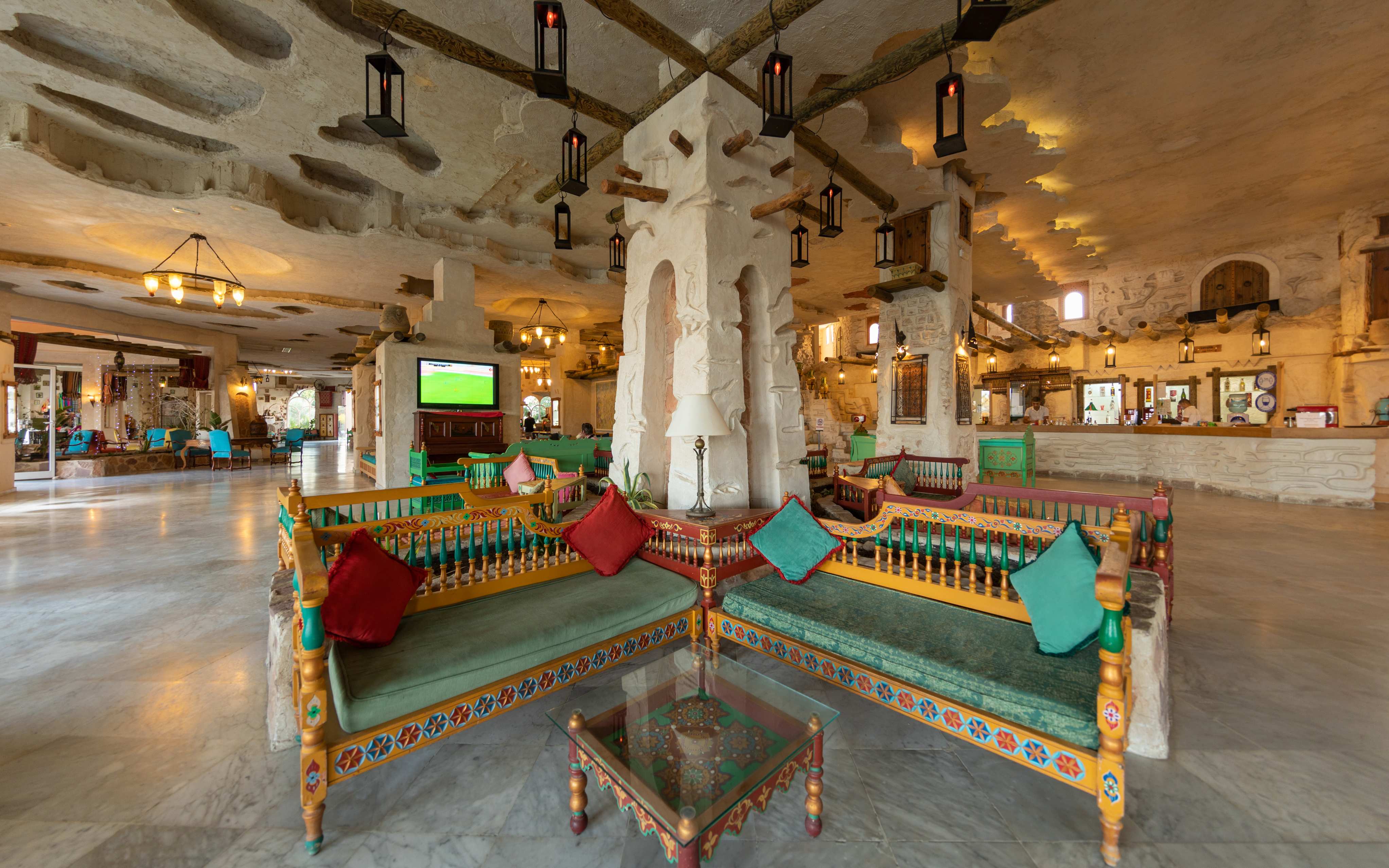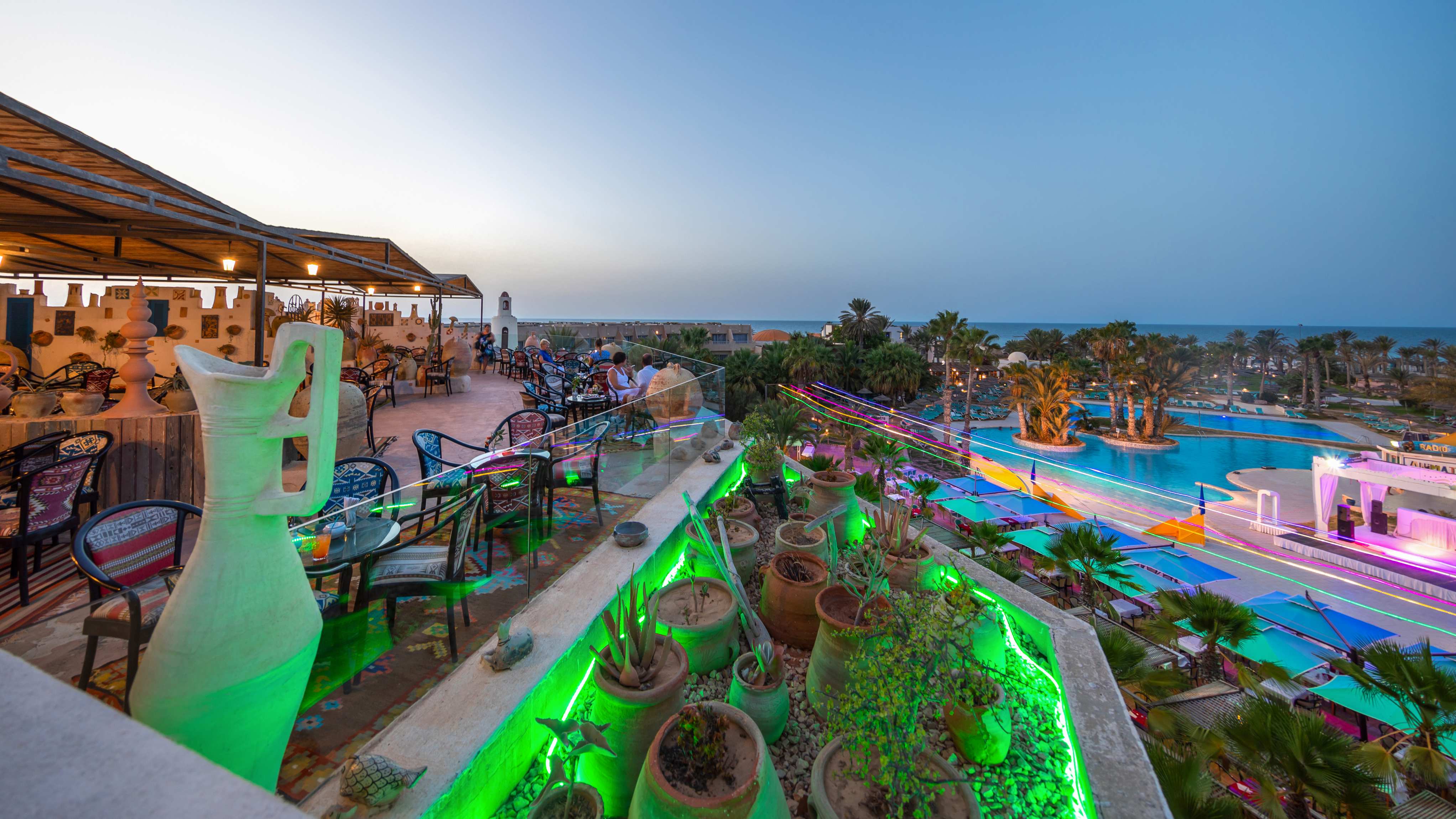 Основен ресторант, 5 а-ла-карт ресторанта (тунизийски , рибен ,марокански, ливански , средиземноморски – срещу заплащане/с предварителна резервация, съгласно концепцията на хотела/1 безплатно посещение на 1 от ресторантите при минимум 7 нощувки), 3 бара, мавританско кафене (срещу заплащане), открит басейн, 3 водни пързалки, закрит басейн (от 01.11 до 31.03), закрит басейн с морска вода в Таласо центъра (срещу заплащане), 2 конферентни зали и заседателна зала, магазин, обмяна на валута, денонощна рецепция, Таласо център.