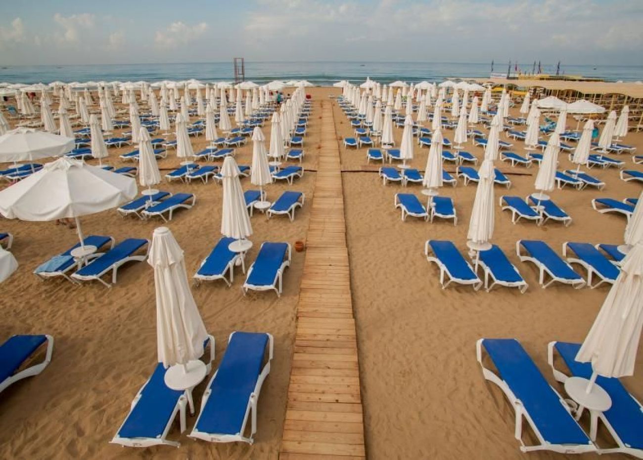 Шезлонги, чадъри, плажни кърпи - безплатно. Вход в морето - пясък.
